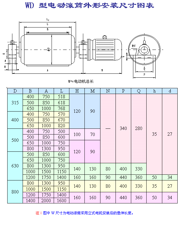 (1).因目前外裝式電動滾筒尚未制定相關(guān)行業(yè)標準,本廠將該型號電動滾筒首位代號用W(“外裝”的首位漢語拼音)表示。外裝式電動滾筒外置電機可分為立式電機和臥式電機,用戶訂購時請加以說明;